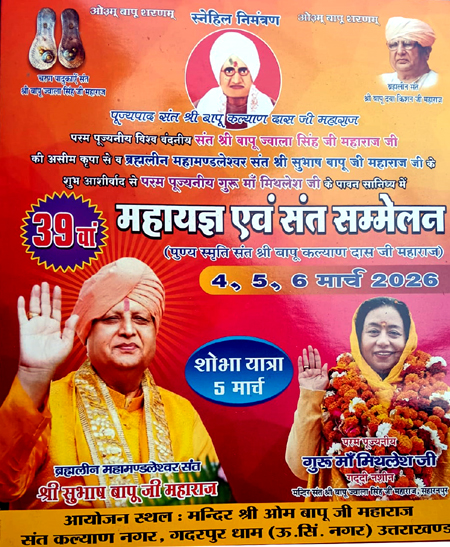 श्री ओम बापू जी मंदिर में गदरपुर में परम पूज्यनीय गुरु माॅं मिथलेश जी के पावन सानिध्य में 39 वाॅ महायज्ञ एवं संत सम्मेलन  04 मार्च से आयोजित आयोजित -05 मार्च को विशाल शोभायात्रा का आयोजन